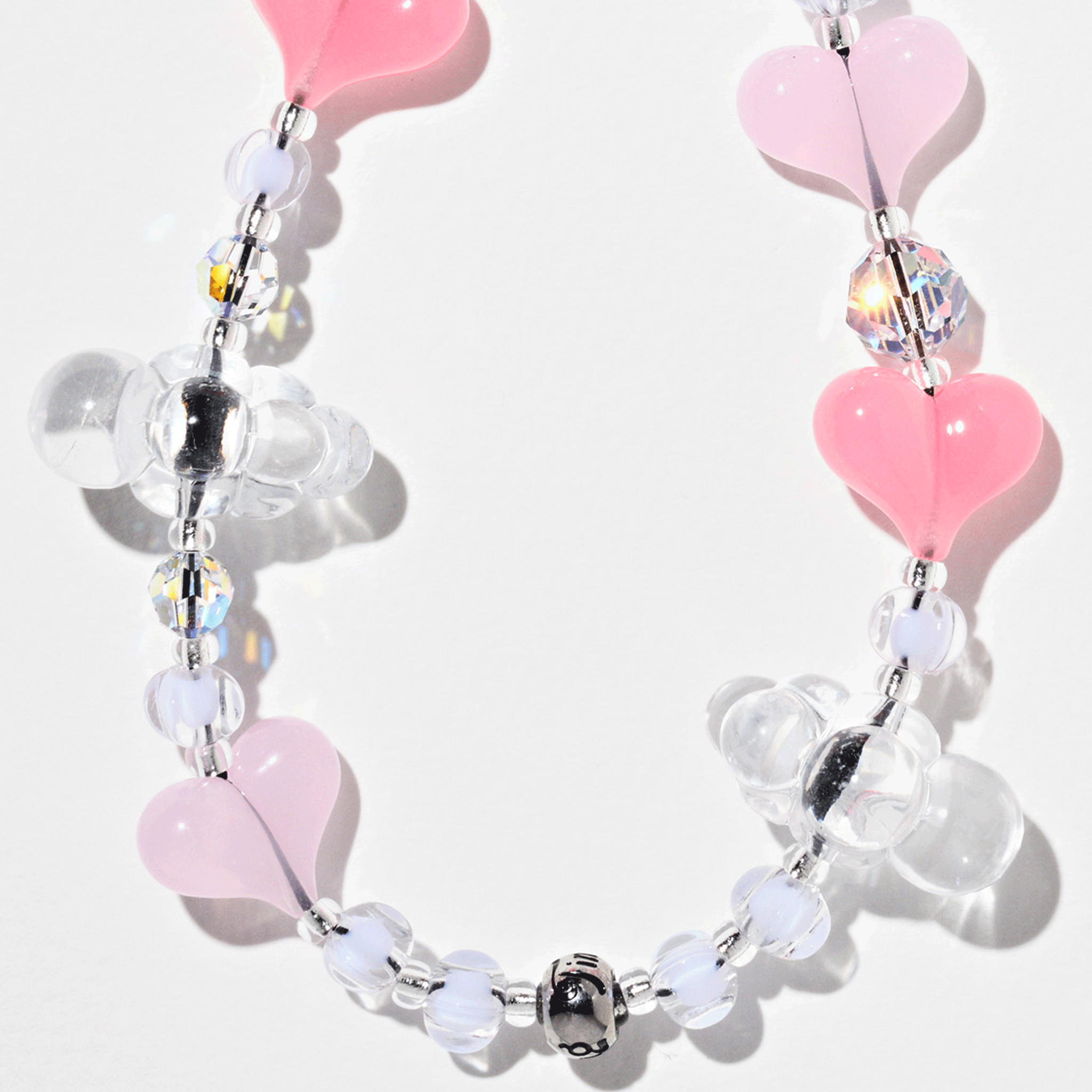 Hand-strung with translucent acrylic clouds, pink acrylic hearts, Crystals by Swarovski® and Japanese Miyuki® beads on reinforced silk nylon cord with stainless steel String Ting branded end bead. Pull-tested to withstand up to 10lbs of force.