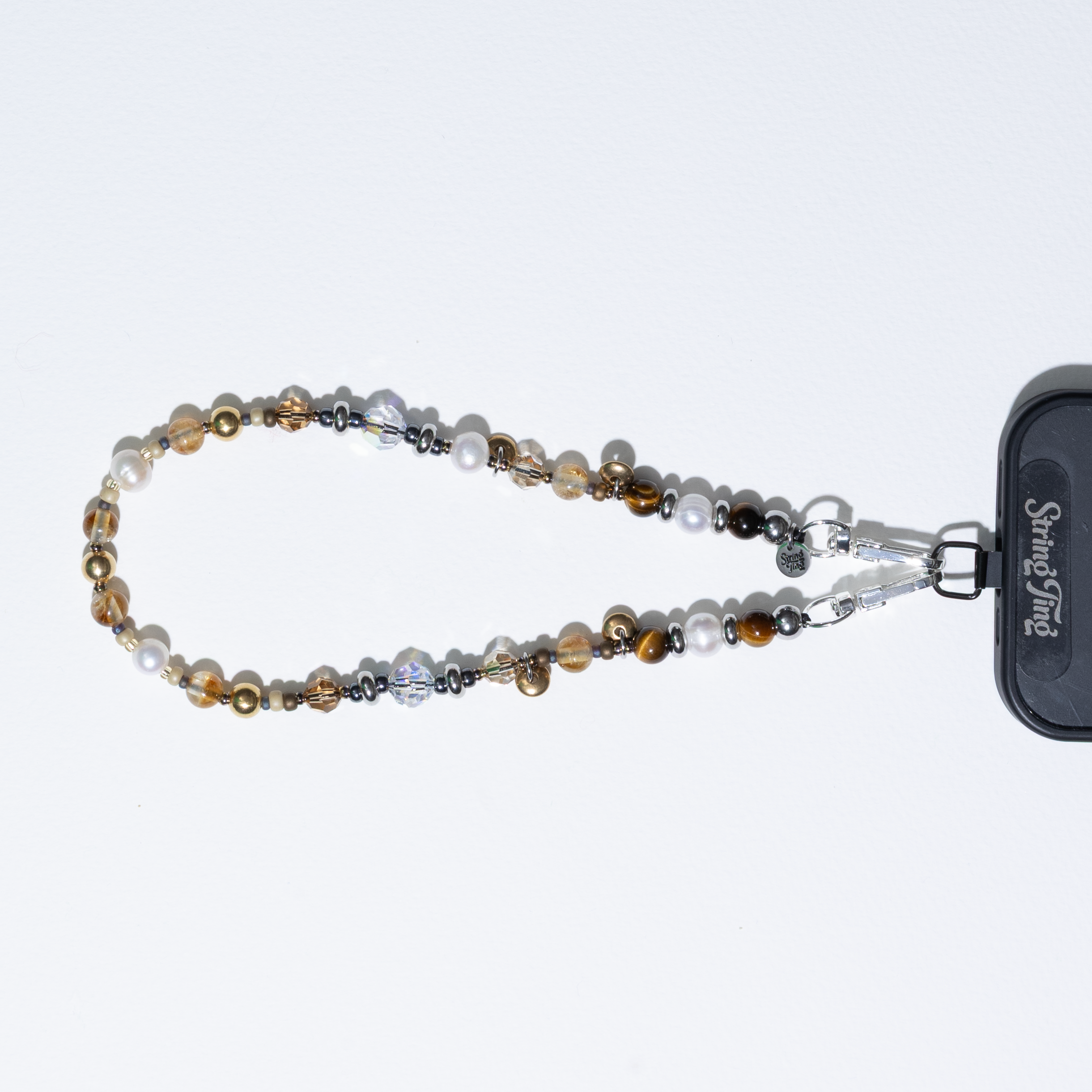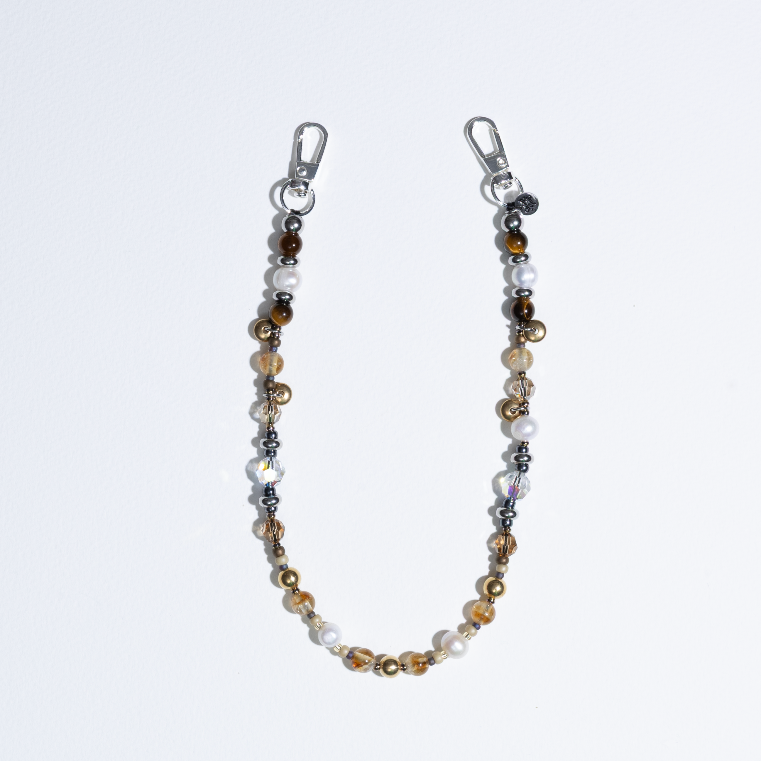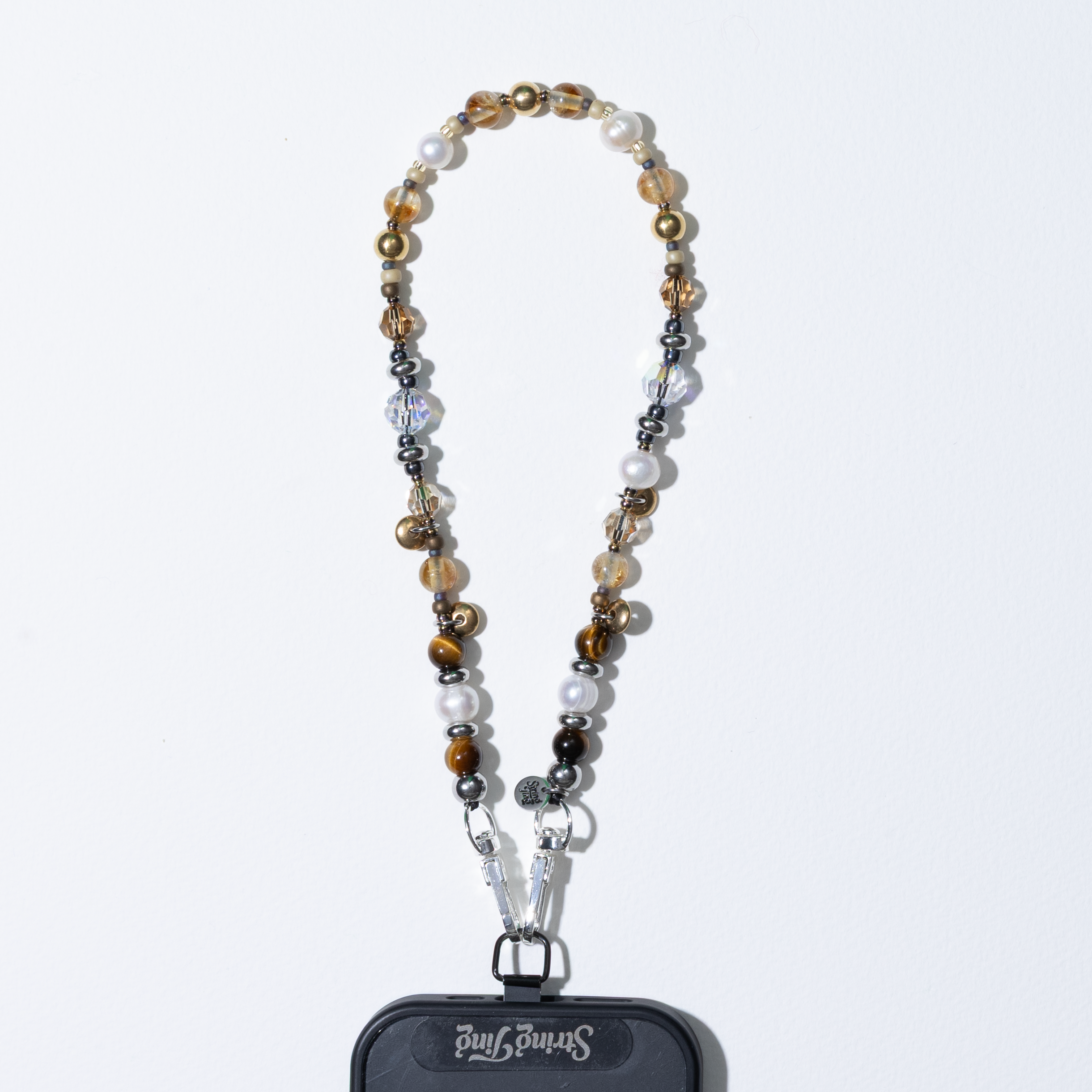 Hand-strung with Grade A semi-precious Tiger's Eye and Citrine, Freshwater Pearls, golden brass beads, Crystals by Swarovski®, and steel accents on reinforced cord with metal swivel clips and String Ting branded end bead. Pull-tested to withstand up to 10lbs of force.