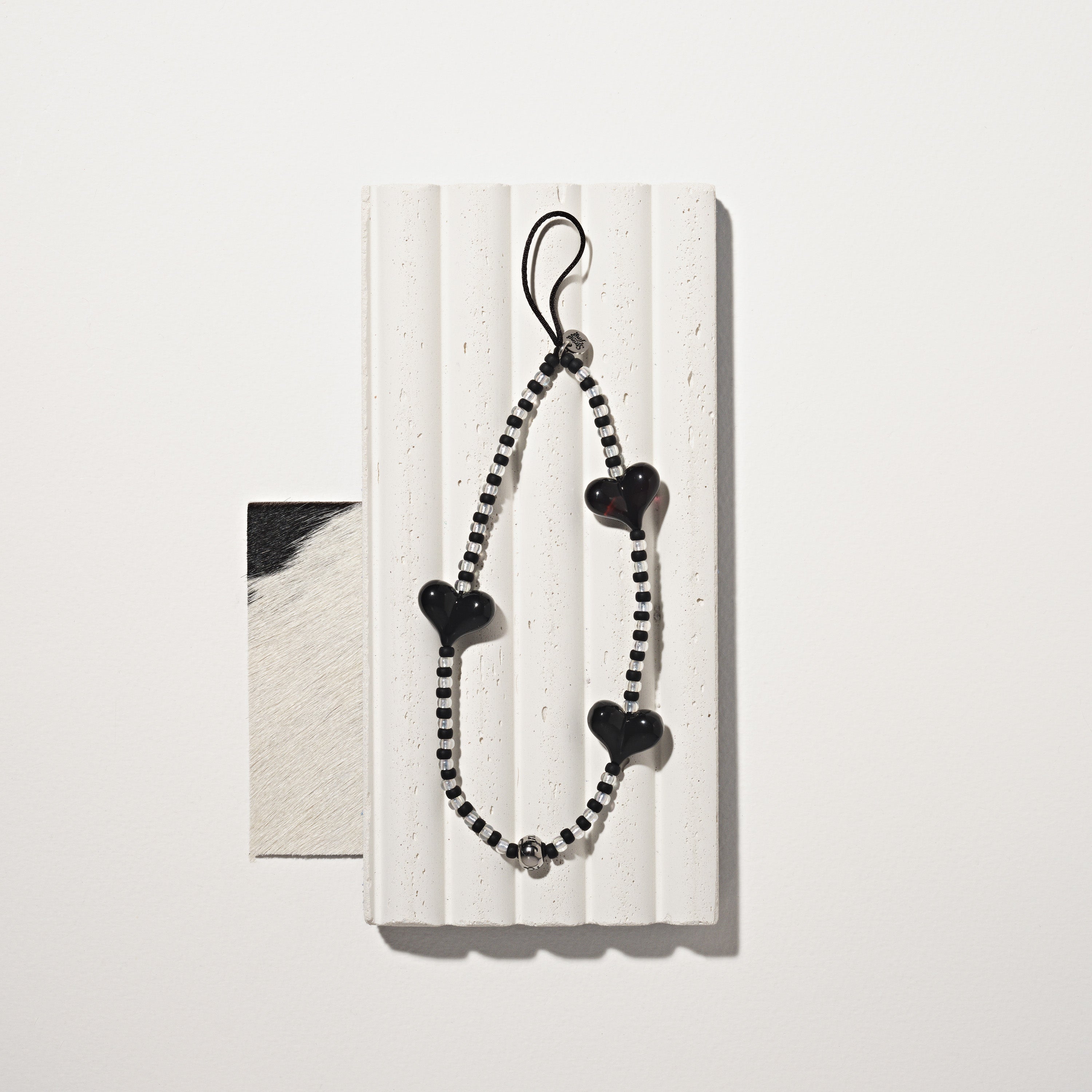 Featuring our signature String Ting heart beads in deep midnight black, hand-strung on nylon cord. The monochromatic palette of black hearts against the striped pattern of Japanese Miyuki® beads creates striking contrast and sophisticated drama. Finished with our signature stainless steel String Ting branded end bead. The silk-lined cord elevates this from phone accessory to luxury experience.