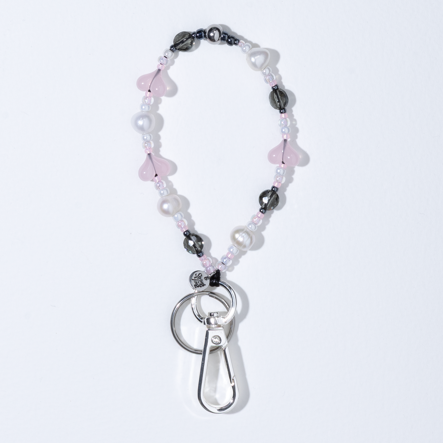 Hand-strung with Freshwater Pearls, Crystals by Swarovski®, Japanese Miyuki® beads, and 3D acrylic heart beads on reinforced cord with silver-tone keyring and swivel clasp. Pull-tested for everyday adventures.