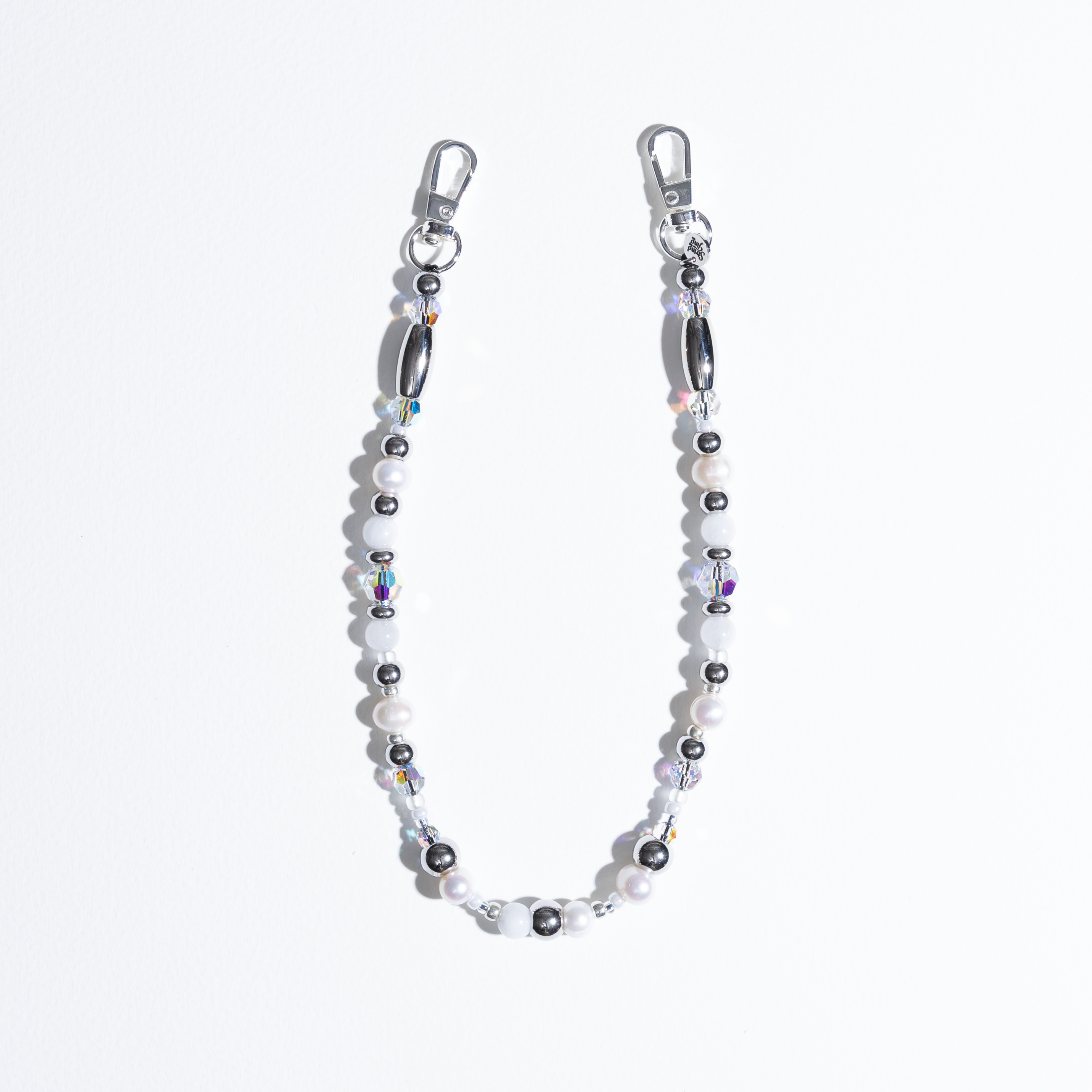 Hand-strung with genuine Freshwater Pearls, Grade A Moonstone with that signature ethereal glow, and multiple sizes of Crystals by Swarovski® that throw rainbow light with every movement. Elongated 304 stainless steel bar beads and polished silver spheres add modern edge, while Japanese Miyuki® beads create perfect balance throughout. The varying textures catch light at different angles — pearls shimmer, moonstone glows, crystals flash. Finished with our signature stainless steel String Ting branded end bead. A labor-intensive design that justifies every penny.