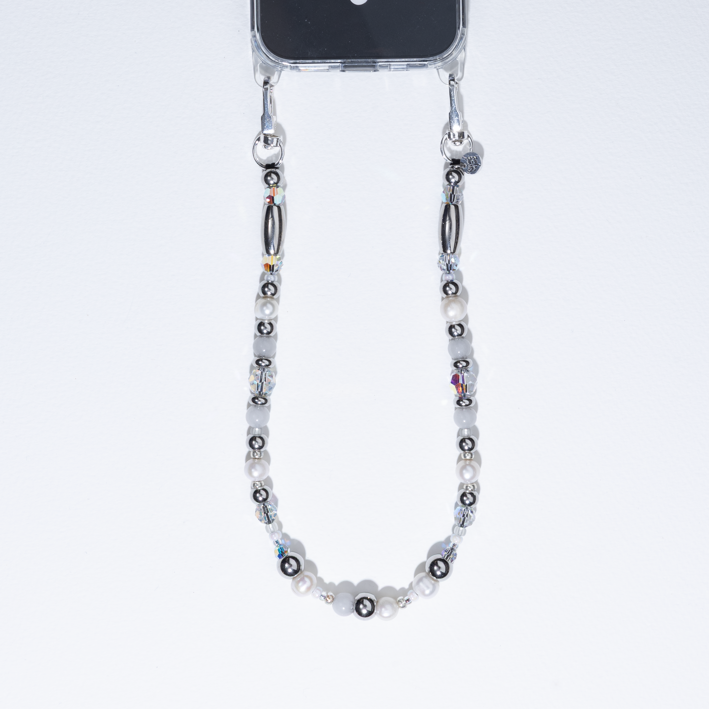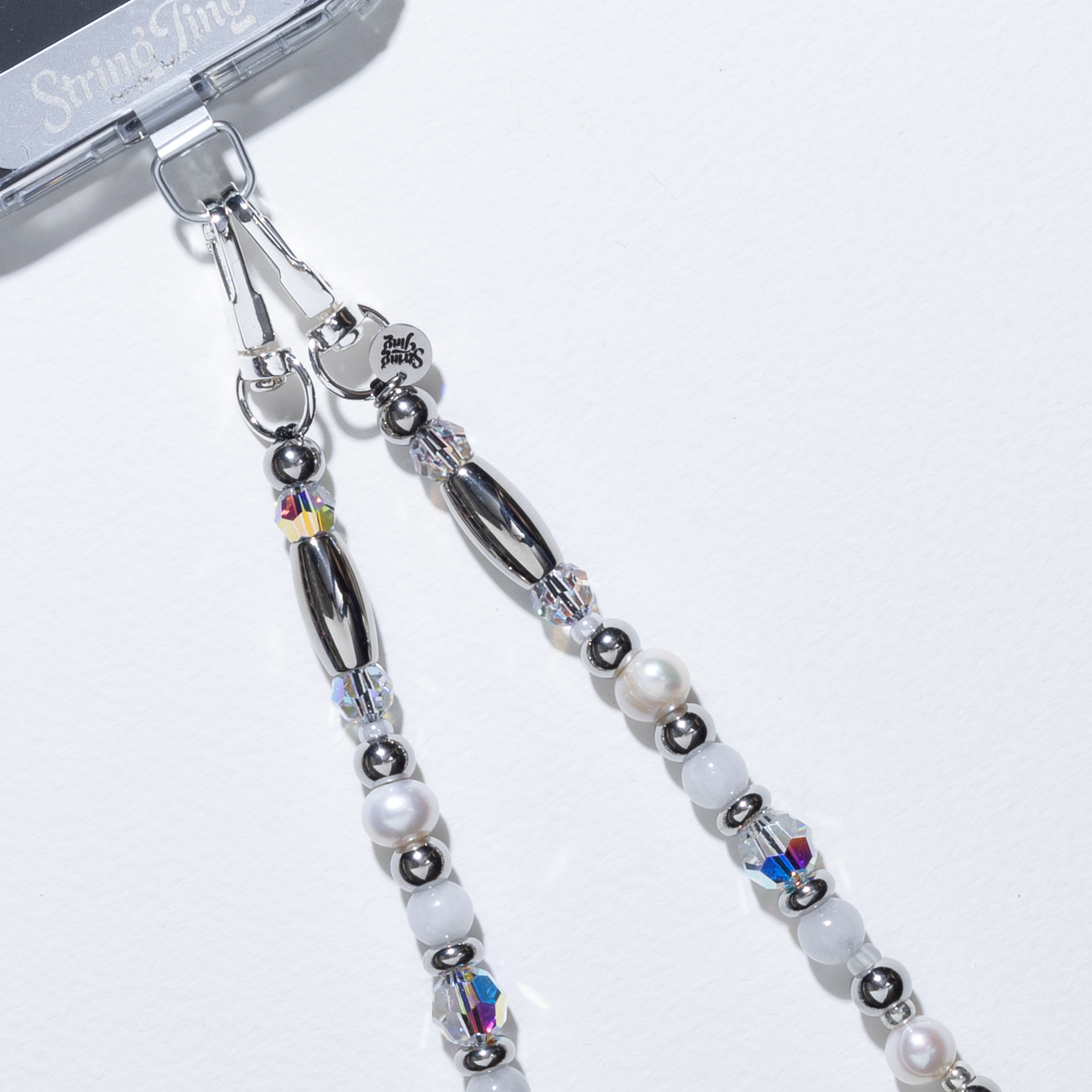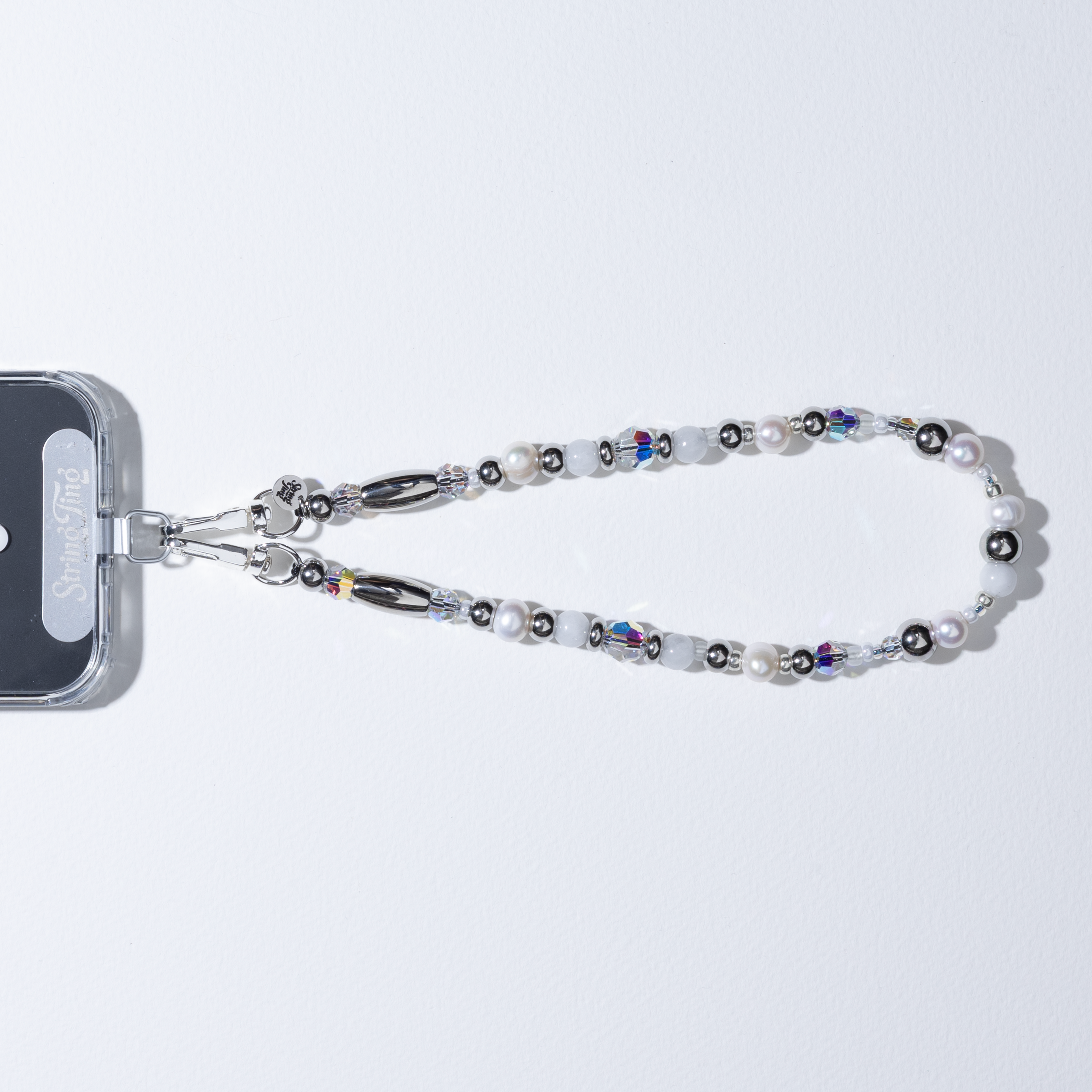 Attach the clips to your phone case's side holes for a stunning side to side effect, or clip both clips to one side for classic wristlet styling with our Phone Strap Card for universal attachment. Worn as a wristlet, watch the moonstone and pearls catch light from every angle — this one glows. Perfect for layering with other String Tings or wearing solo as a statement piece.