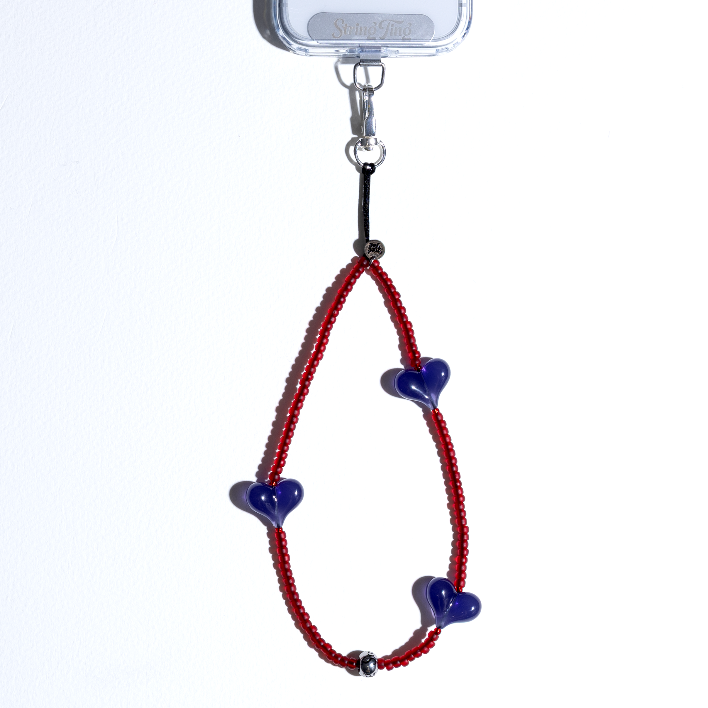 Featuring three of our exclusive String Ting signature heart beads in rich prism violet opaque — each one originally designed and manufactured by us for a shape and quality you won't find anywhere else. Strung on precision Japanese Miyuki® beads in a matte transparent red with a jewel-like depth that glows when light passes through. Finished with our stainless steel String Ting branded end bead.