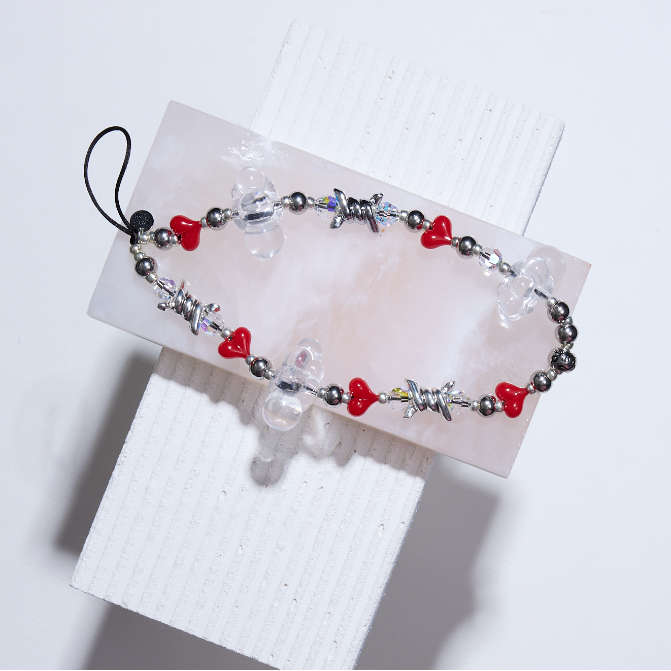 When hearts meet rebellion in the softest way. Our signature mini red hearts float between translucent jelly clouds and edgy alloy barb wire for a look that's tough enough for the streets but sweet enough for your soul.