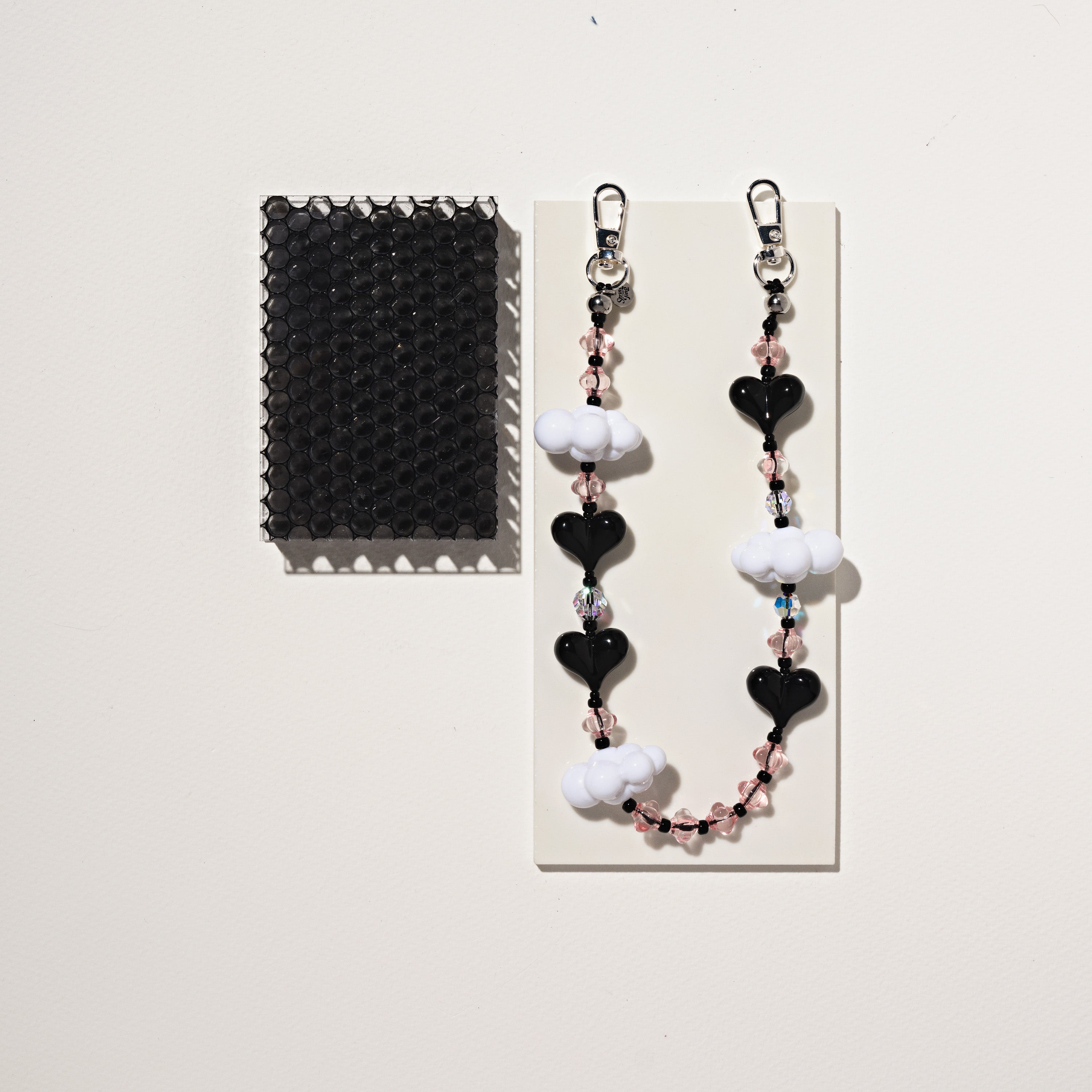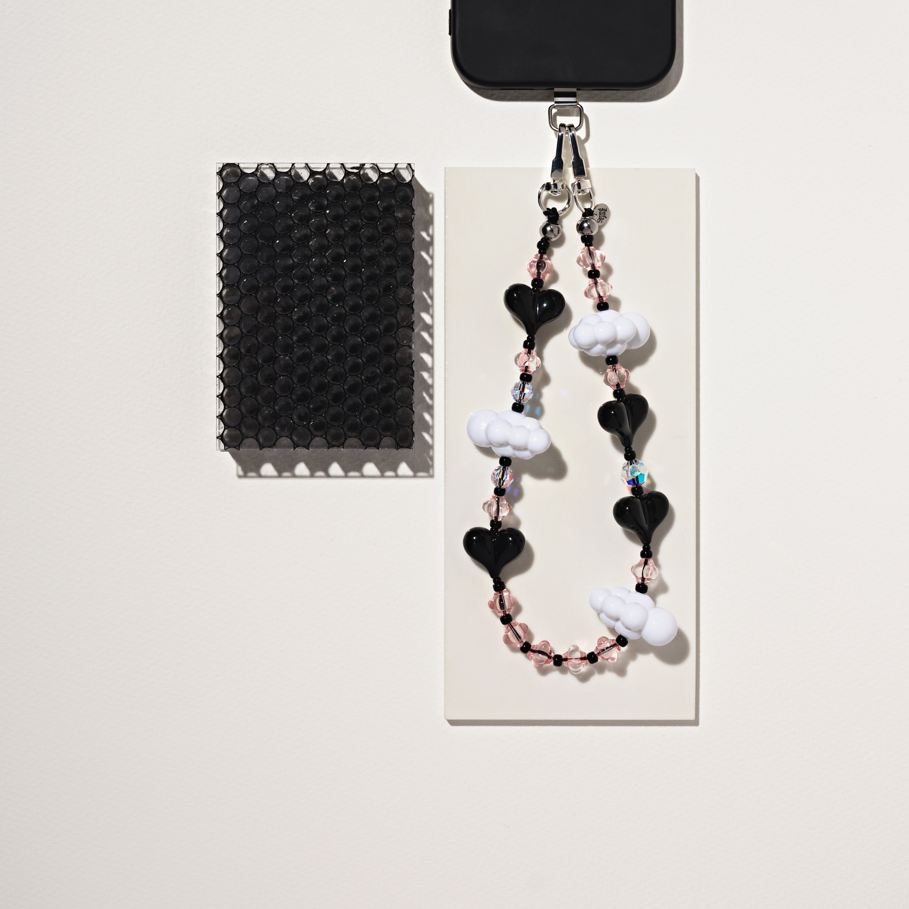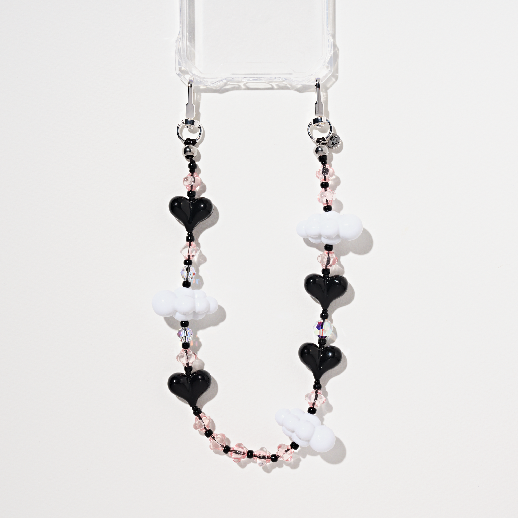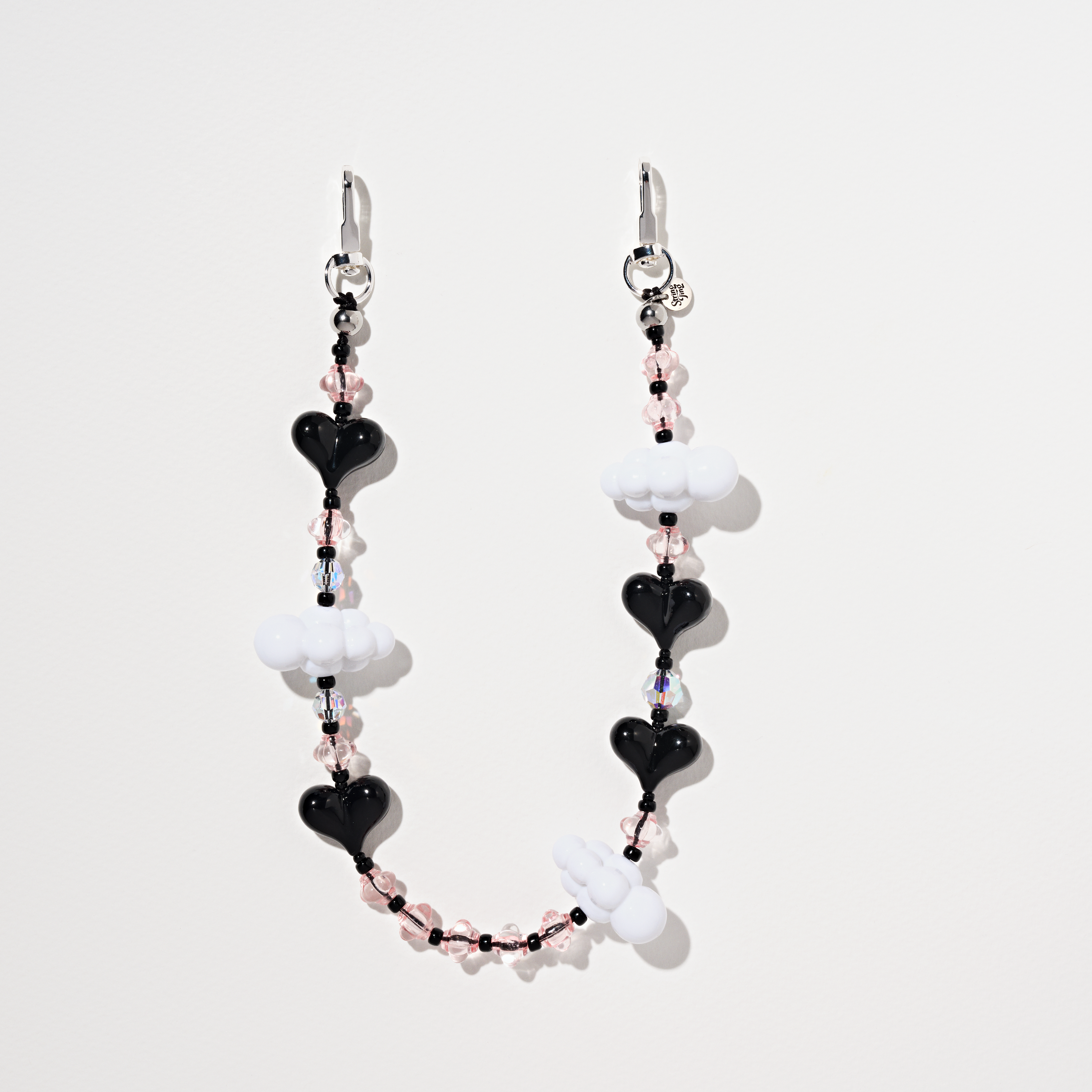 Hand-strung with glossy black heart beads and dimensional white cloud beads, interspersed with soft pink beads and Crystals by Swarovski® with Japanese Miyuki® beads. The 3D hearts and clouds have actual weight and presence — these aren't flat charms, they're sculptural elements that make this piece feel collectible.