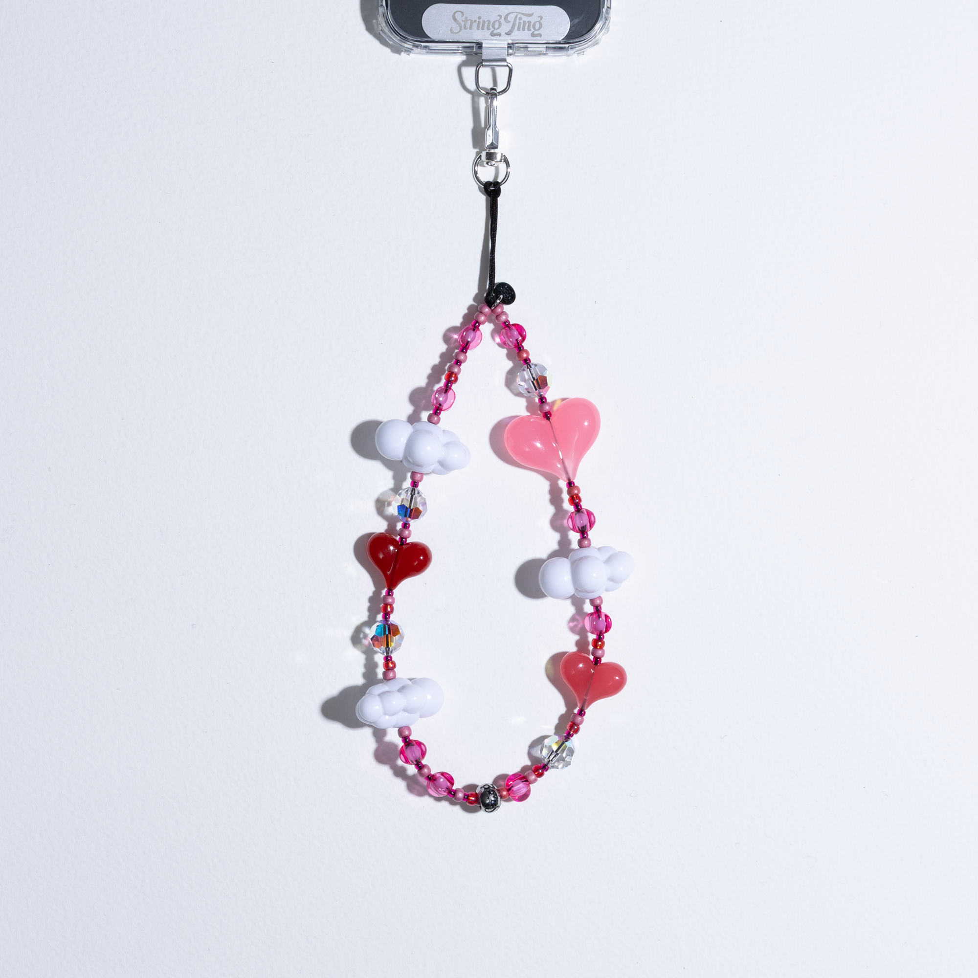 Glossy resin hearts in graduating pink-to-red ombré float amongst our signature puffy white cloud beads — a kawaii dreamscape brought to life. Crystals by Swarovski® scatter light in every direction while precision Japanese Miyuki® beads in signature pink tones connect each element with seamless rhythm. Finished with our signature stainless steel String Ting branded end bead.