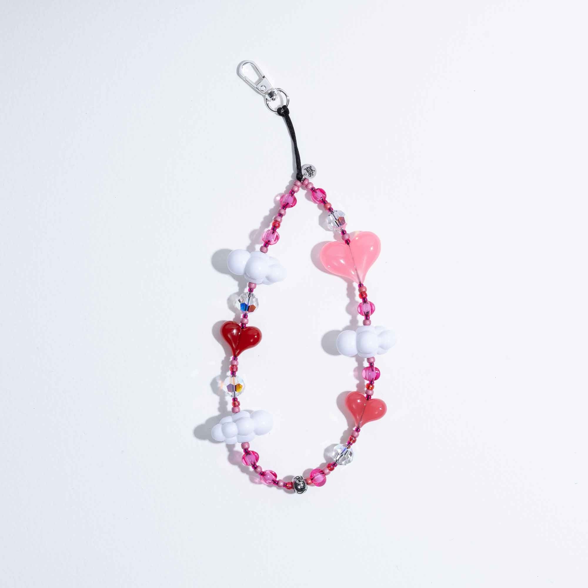 Three different heart sizes in soft pink, coral and deep red create an ombré love gradient that shifts as you move — a design detail that makes this piece impossible to put down. The clouds add that unmistakable kawaii softness, making this our most romantically playful wristlet yet.