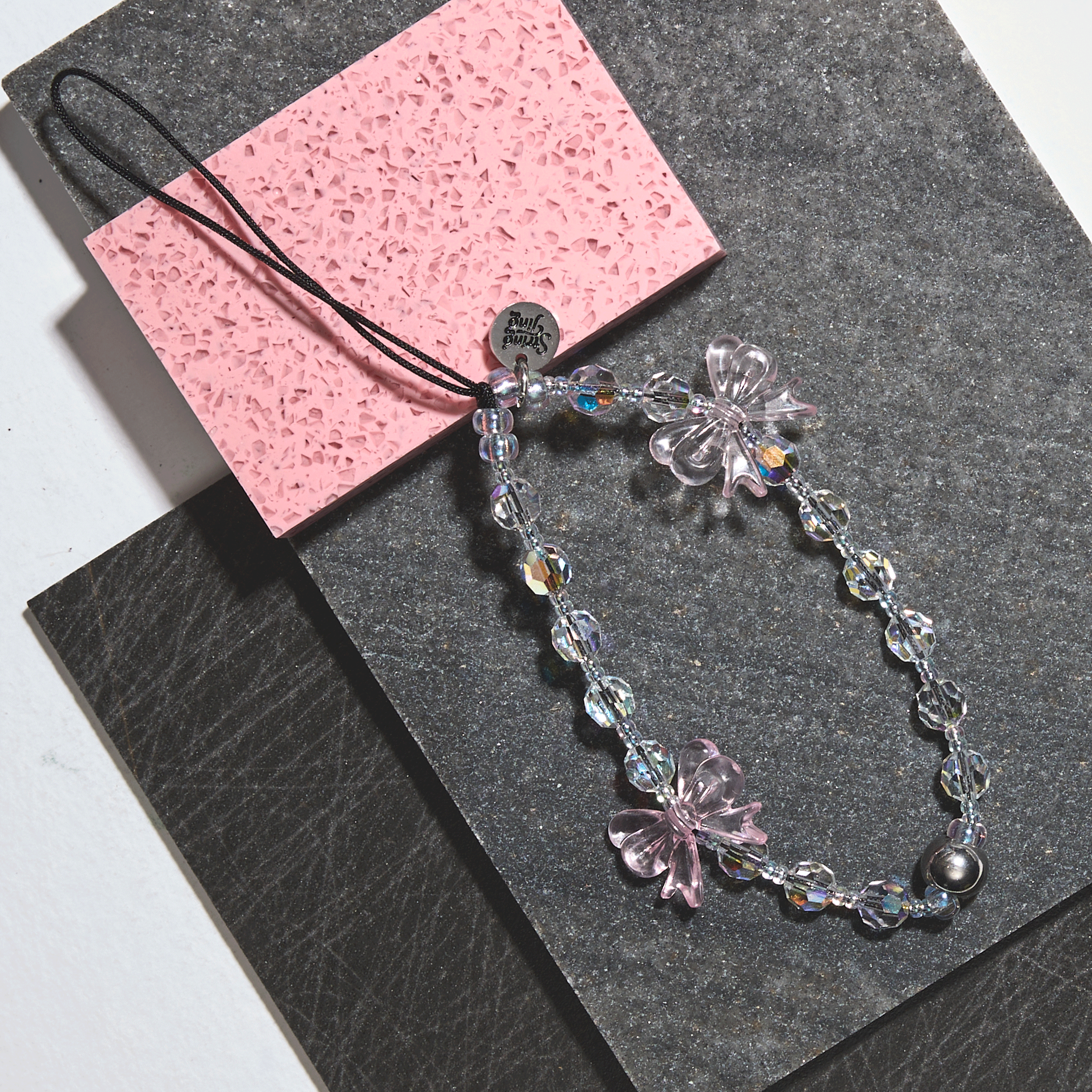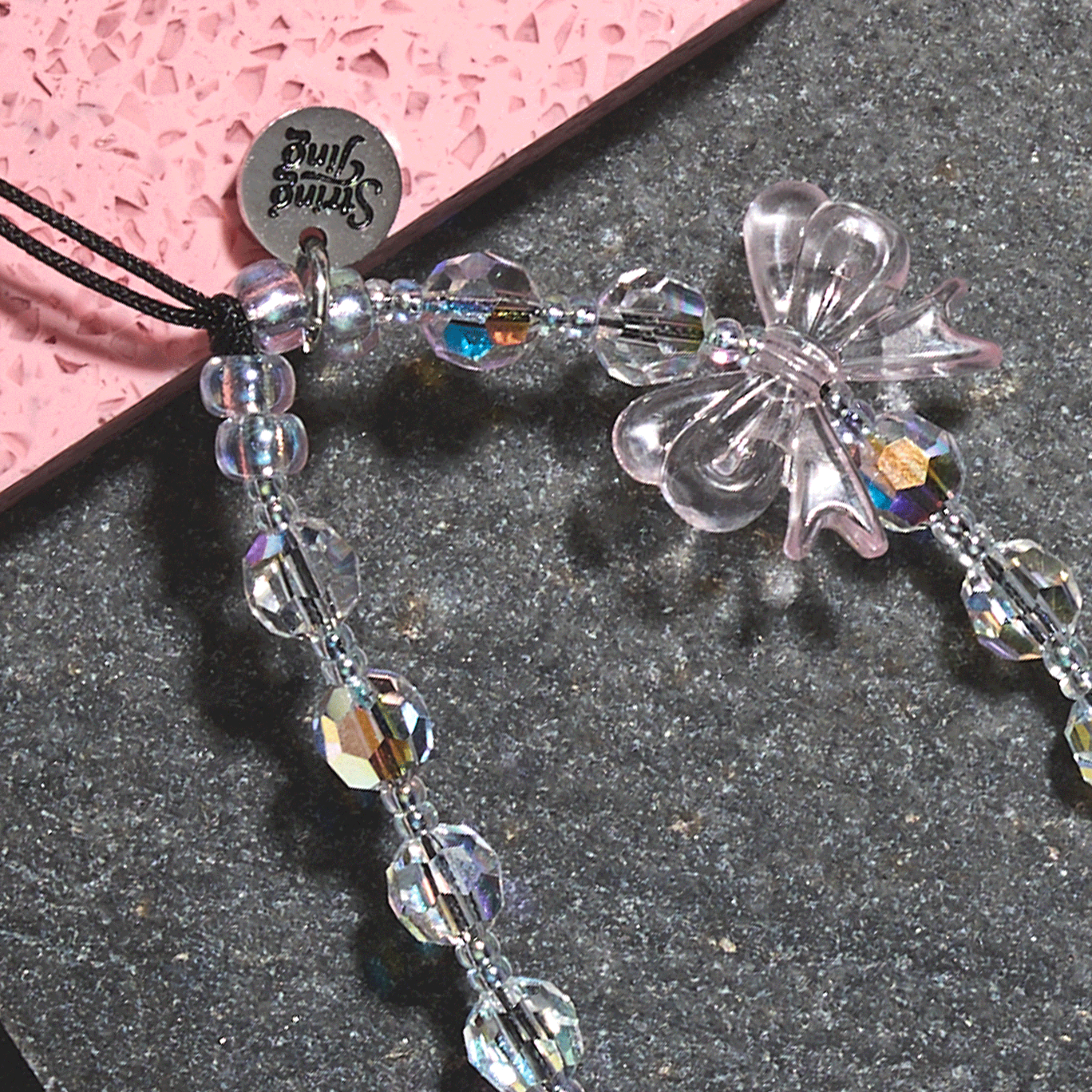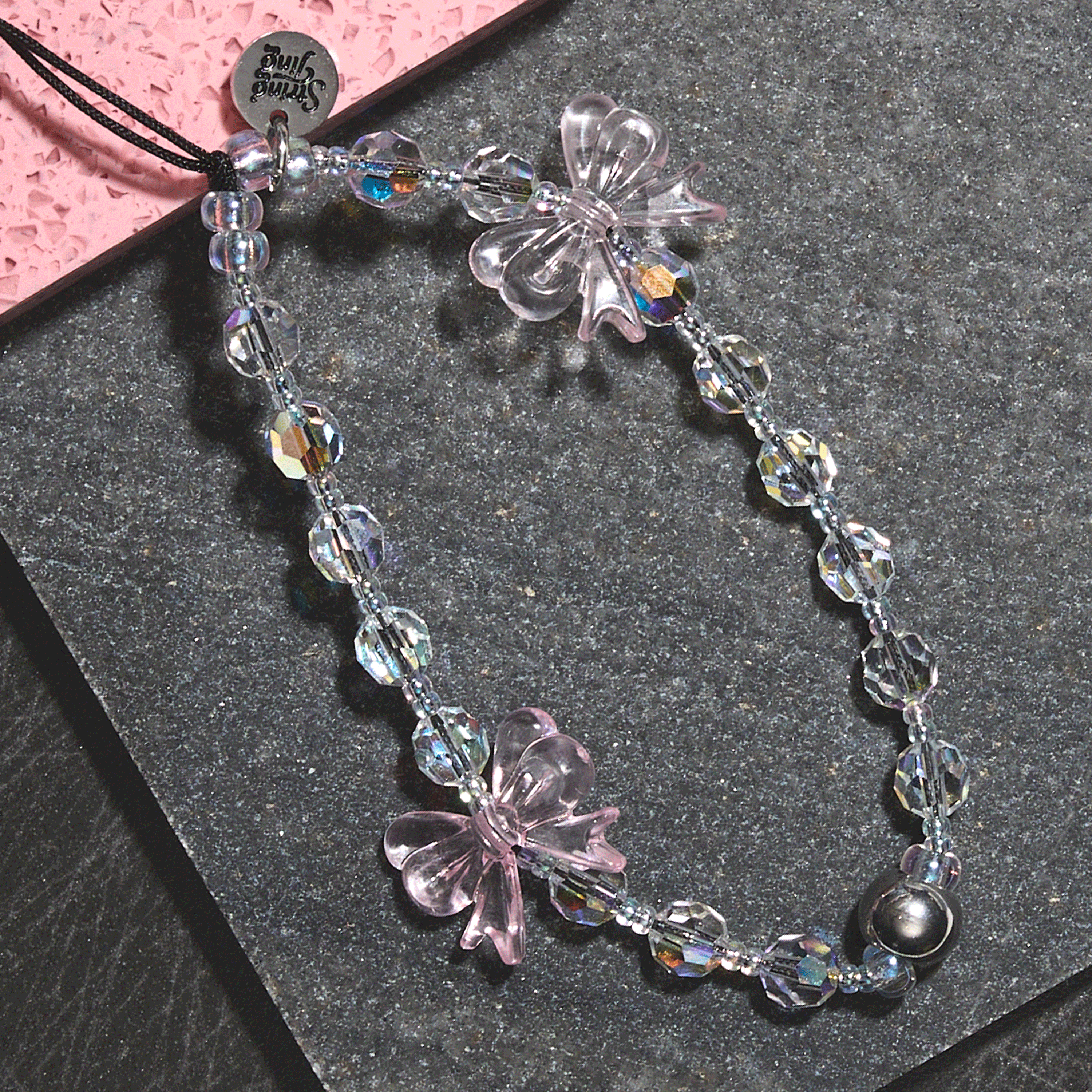 Hand-strung with Crystals by Swarovski®, glossy heart beads, and metallic accents on reinforced silk nylon cord with stainless steel String Ting branded end bead. Pull-tested to withstand up to 10lbs of force.