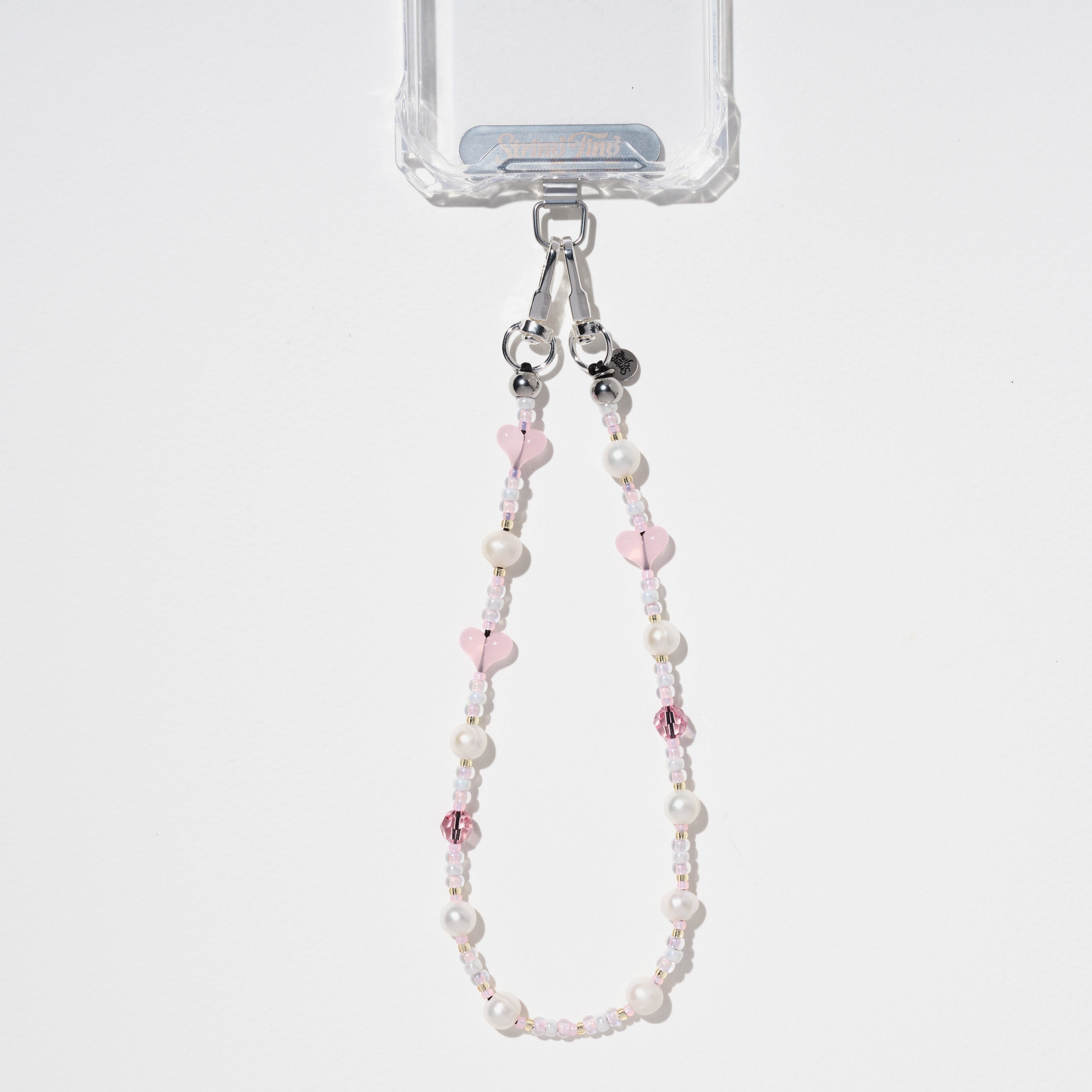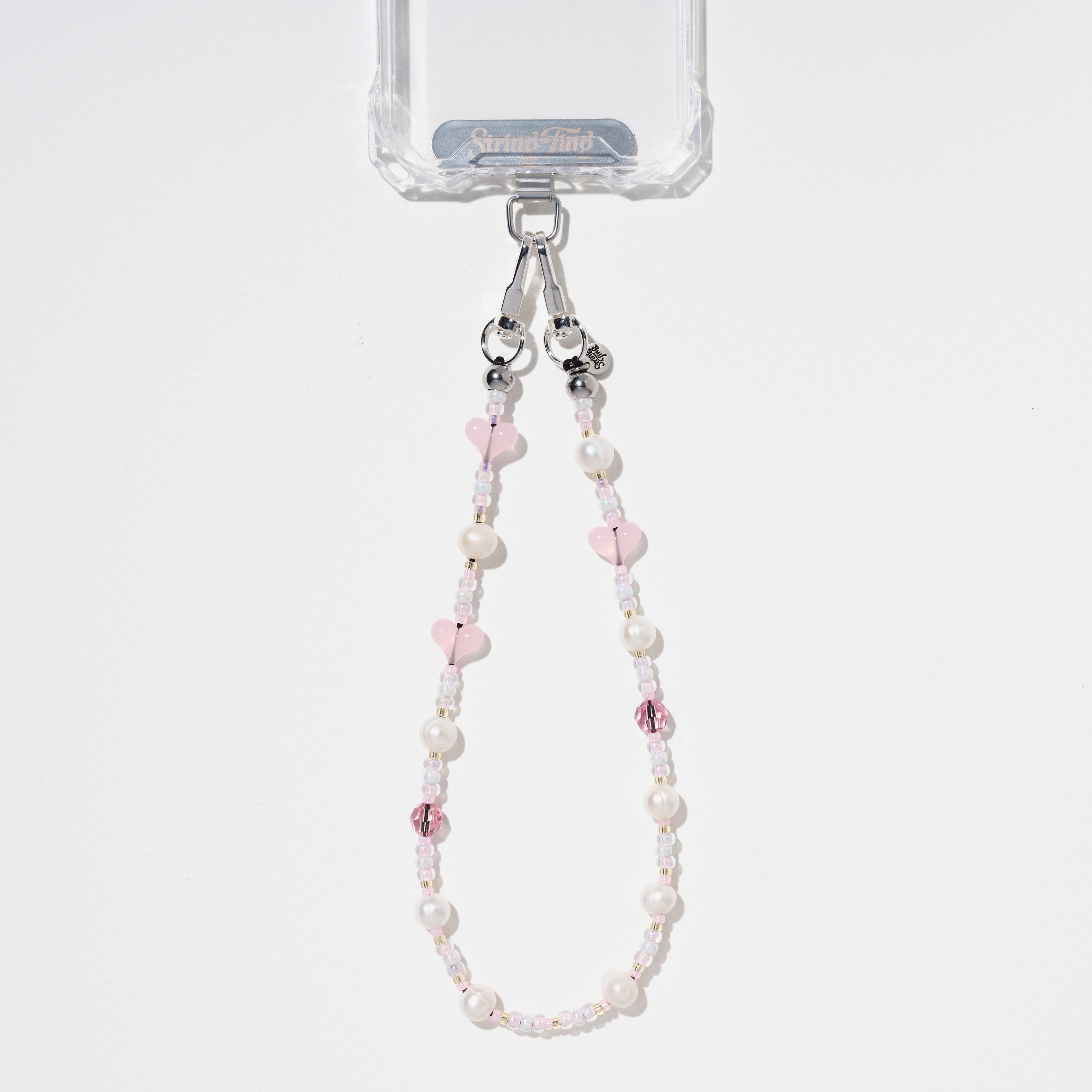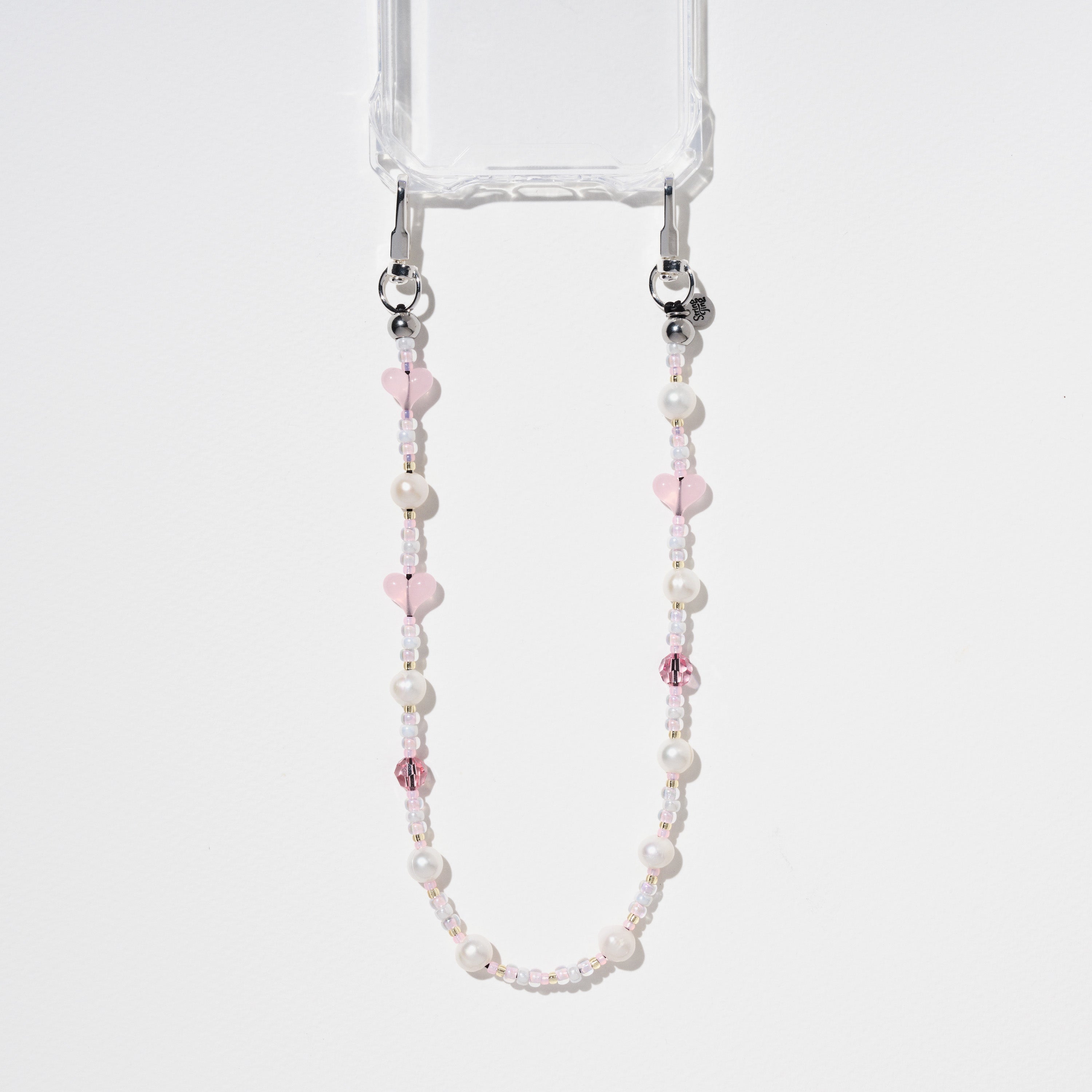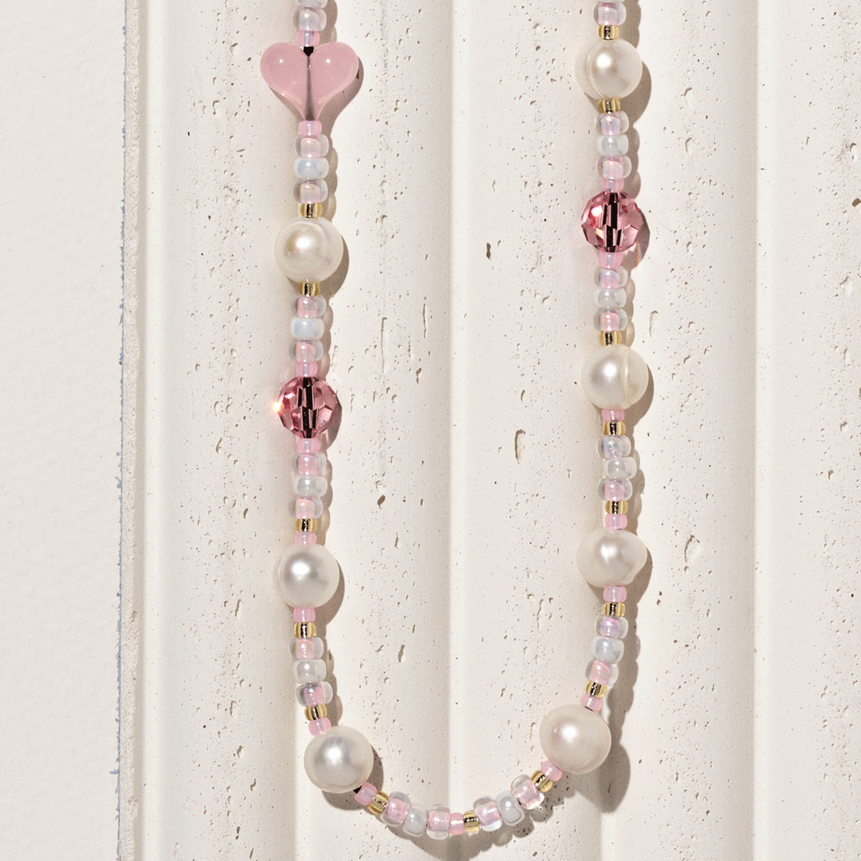 Hand-strung with Freshwater Pearls, candy-pink acrylic hearts, Crystals by Swarovski®, and ceylon Japanese Miyuki® beads on reinforced silk nylon cord with stainless steel String Ting branded end bead. Pull-tested to withstand up to 10lbs of force.