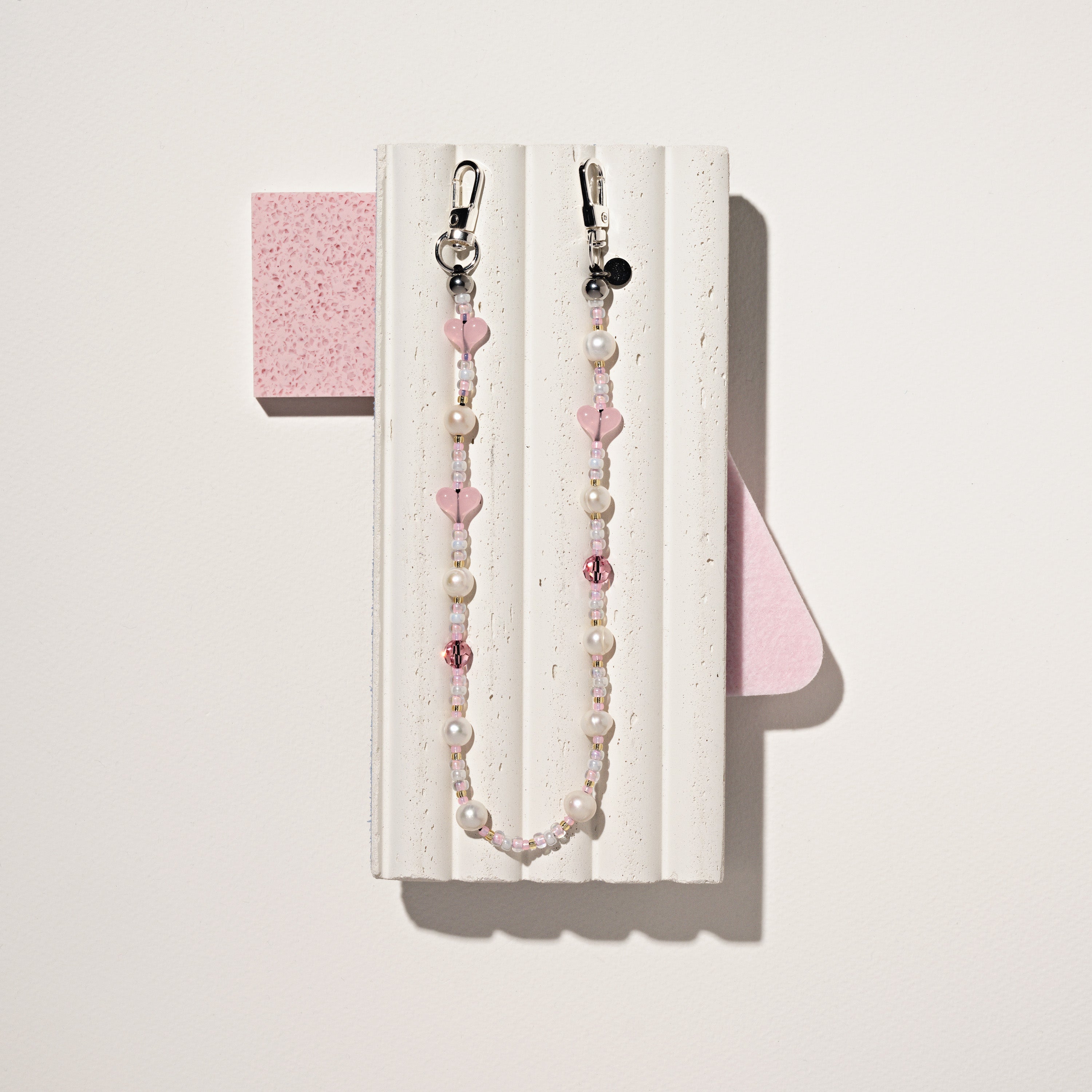 Lustrous Freshwater Pearls cascade alongside candy-pink acrylic hearts and rose Crystals by Swarovski®, woven together with ceylon Japanese Miyuki® beads in the softest blush tones. Every pearl hand-selected for its organic glow, every heart positioned to catch your eye. This is the love child of our two most beloved designs — inheriting the sophistication of Venus Pearl Trap and the playful spirit of Love on Venus. A modern heirloom that feels sweet, strong, and a little mischievous. The perfect chain for pink lovers who want their accessories with attitude.