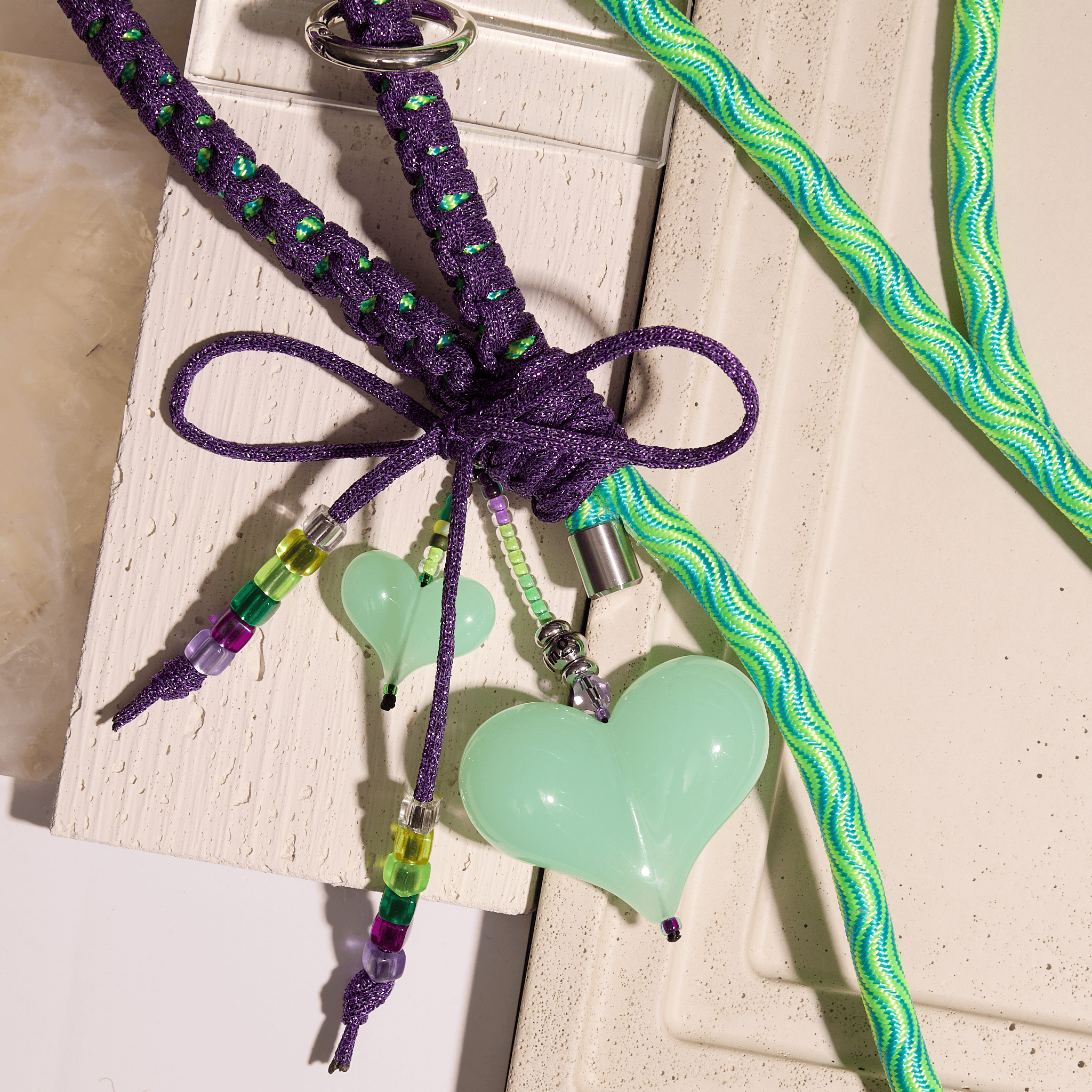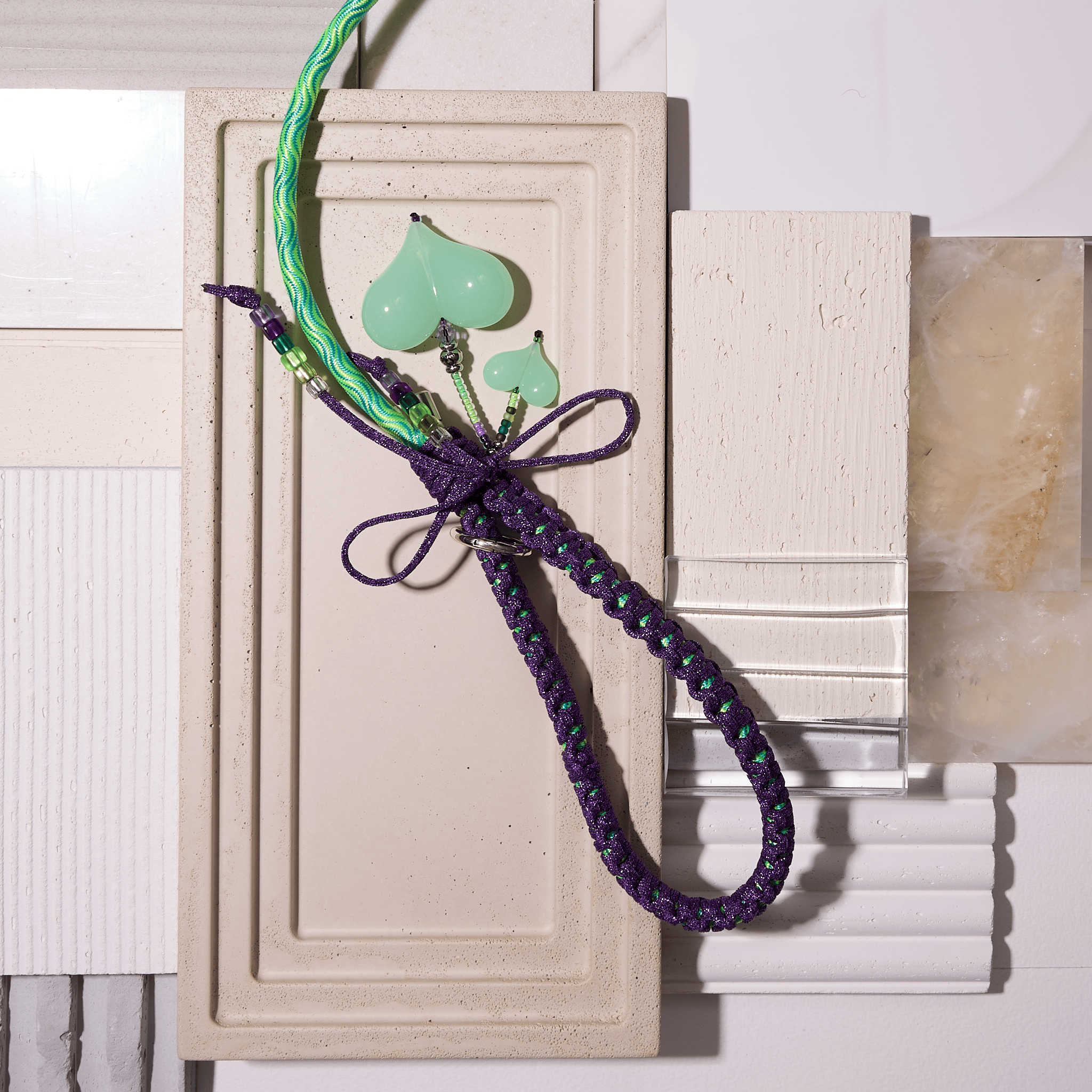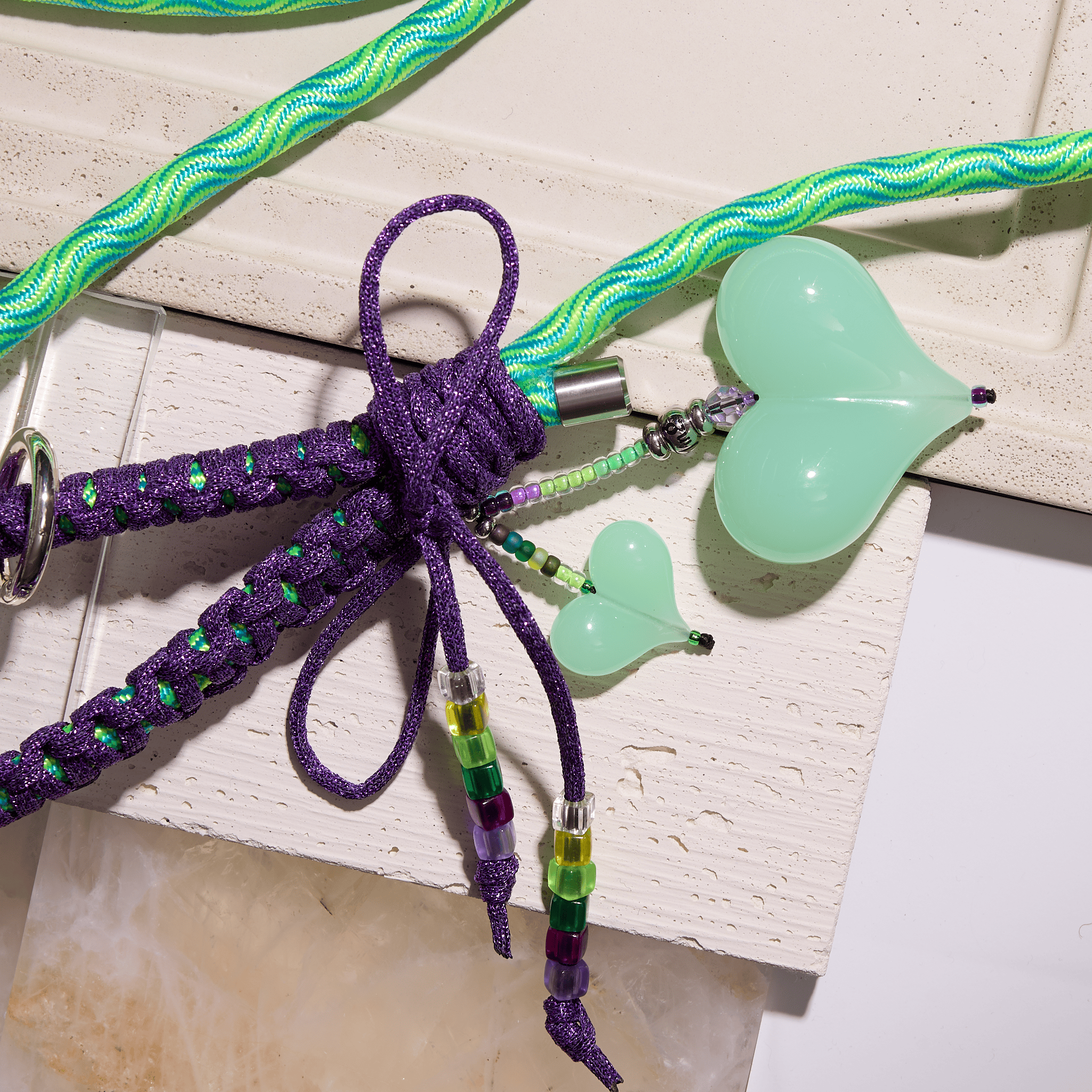 Materials: Premium double-braided PPM paracord with silky shiny surface in electric lime green, sparkly purple braided handle with hand-strung beaded accents featuring mint heart charms and Crystals by Swarovski®, durable hardware.