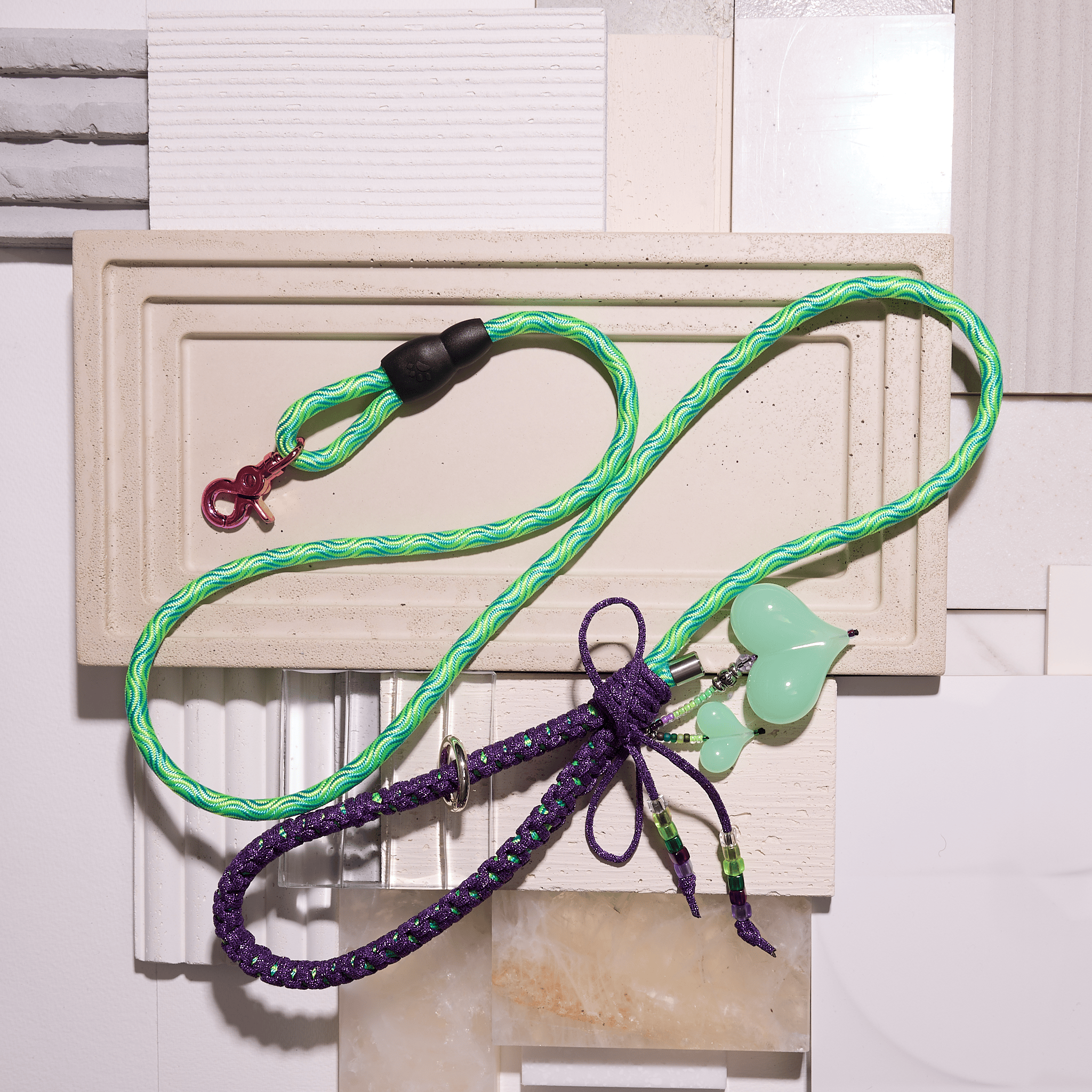 The Adventurer is one-of-one — handmade in our London studio by Rachel and never to be repeated. Crafted from premium double-braided PPM paracord with a 48-strand sheath structure, this lead features vibrant electric lime green wave details, woven with a sparkly purple handle that catches the light beautifully (pls note - the sparkle handle is very solid materials but the purple is not soft). The hand-strung beaded details showcase mint green heart charms with gradient cube beads in purple, lime, and yellow with Crystals by Swarovski®. Lightweight, silky-smooth, and built for pups who lead the way on every adventure.